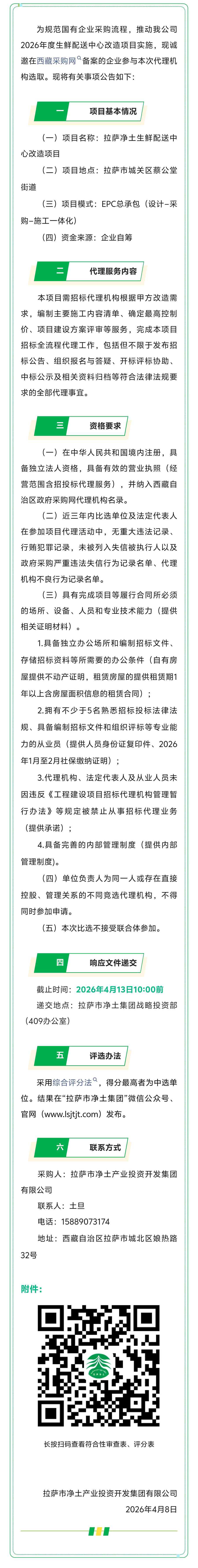關(guān)于公開選取2026年度生鮮配送中心改造項(xiàng)目招標(biāo)代理機(jī)構(gòu)的公告