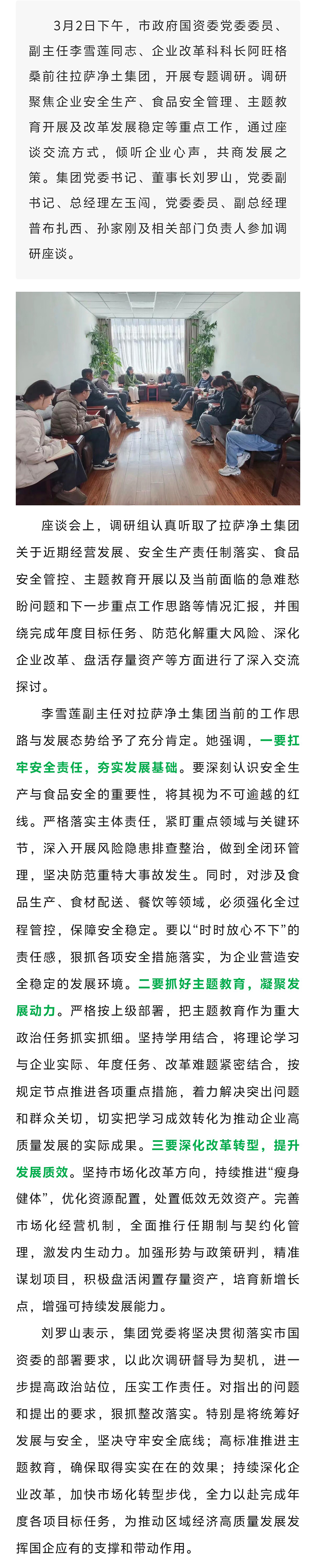 市政府國資委副主任李雪蓮一行赴拉薩凈土集團開展“四下基層”專題調研